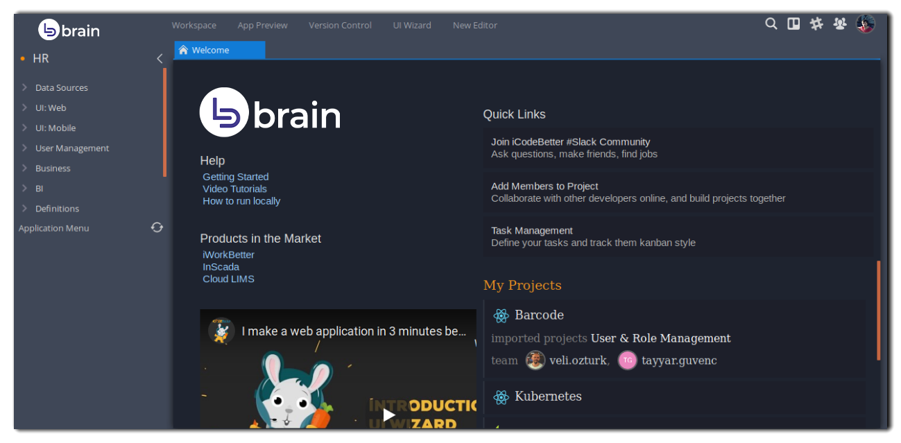 On top of the page there is main menu. Workspace is where you manage all your projects. UI Wizard is where you can create your prototypes in few seconds. Version control has a sub-menu so it's better to explain it below separately.